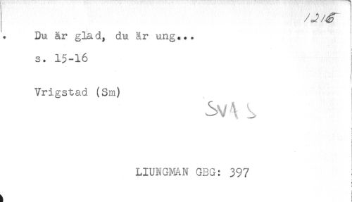 //// j / J //// Du år glad, du är ung... //// S. 15-16 //// Vrigstad (Sm) //// ! //// < //// ! //// ! //// LIUNGMAN GBG: 397 //// < ////