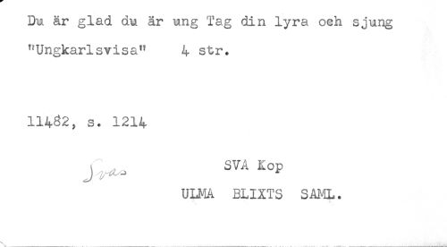 //// Du är glad du är ung Tag din lyra och sjung //// "Ungkarlsvisa" 4 str. //// 11482, s. 1214 //// j ,, SVA Kop //// ULMA BLIXTS SAML. ////