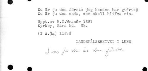 //// Du är ju den första jag handen har gifvit^ //// Du är ju den enda, som skall blifva min- //// Uppt.av H.O.Wranér 1881 //// Kyrkby, Bara hd. Sk. //// (I A.34) 118:8 //// LANDSMALSRRKIVET I LUND //// J ^ y ^ ^ ////