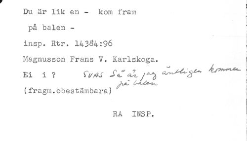 //// Du är lik en - kom fram ! //// ! //// < //// på balen - //// insp. Rtr. 143^4:96 //// ! //// Magnusson Frans V. Karlskoga. //// Ei i ? Q^J JV / ^^ //// (fragm.obestämbara) //// RA INS P. //// t //// ! //// i ////