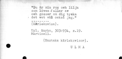//// - ..... - * - - .. . ^ //// "Du är min ros och lilja //// som löven f aller av //// och gossar om dig tycka //// * det vet väå också jag." //// (Kärleksvisa). //// -v . . ^ ^ //// Upl. Harbo, 303:934, s.19. //// Martinell. //// (Enstaka kärleksvisor). //// ^ U L M A ////