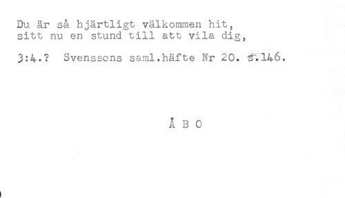//// Du är så hjärtligt välkommen hit, //// sitt nu en stund till att vila dig, //// .. ** //// 3:4.? Svenssons saml.häfte Nr 20. 3.146. //// ÅBO ////