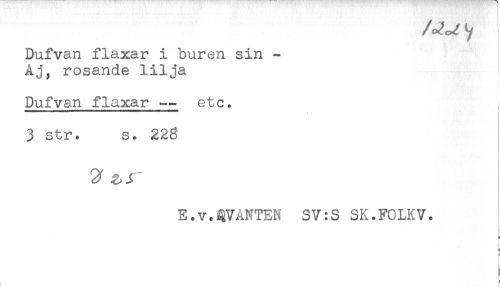 //// Dufvan flaxar i buren sin - } //// Aj, rosande lilja //// Dufvan flaxar - etc. //// 3 str. s. 22g //// < //// a ^ //// E.v.KVANTEN SV:S SK.FOLKV. //// B //// - ////