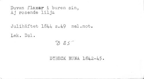 //// Duvan flaxar i buren sin, //// Aj rosende lilja //// Julihäftet 1844 s.49 mel.not. //// Lek. Dsl. //// DIBECK RUNA 1842-45* ////