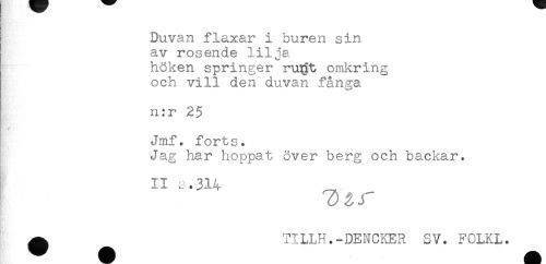 //// Duvan flaxar i buren sin //// av rosende lilja //// höken springer ru^t omkring //// och vill den duvan fånga //// n:r 25 //// Jmf. forts. //// Jag har hoppat över berg och backar. //// II s.314 ^ //// ^ TILLH.-DENC^R SV. FCLKL. ////