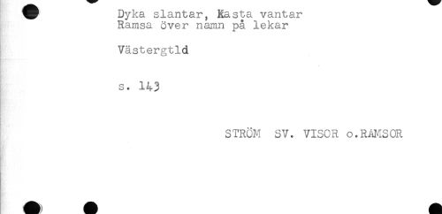 //// Dyka slantar, Rasta vantar //// Ramsa över namn på lekar //// Västergtld //// s. 143 //// STRÖM SV. VISOR o.RAMSOR //// - //// ^^ A ////