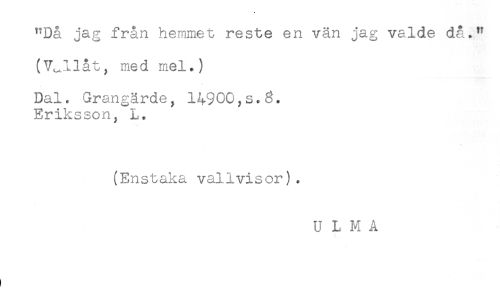 //// "Då jag från hemmet reste en vän jag valde då." //// (V^llåt, med mel.) //// Dal. Grangärde, 14900,s.8. //// Eriksson, L. //// (Enstaka vallvisor). ////