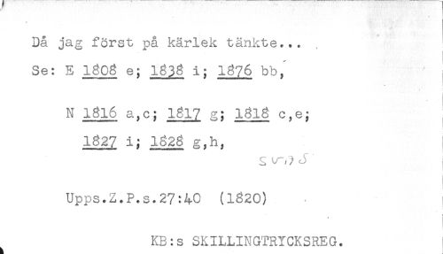 //// * //// Då jag först på kärlek tänkte... //// Se: B 1808 e; 1838 i; 1876 bb,' //// N 1816 a,c; 1817 g; 1818 c,e; //// 1827 i; 1828 g,h, //// L ^ - ? ^ //// Upps.Z.P.s.27:40 (1820) //// ) ////