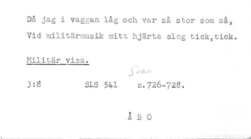 //// Då jag i vaggan låg och var så stor som så, //// Vid militärmusik mitt hjärta slog tick,tick. //// Militär visa. //// 3:3 SLS 541 s.726-728. ////