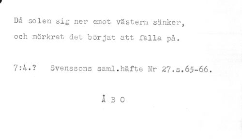 //// Då solen sig ner emot västern sänker, //// och mörkret det börjat att falla på. //// 7:4.? Svenssons saml.häfte Nr 27.s.65-66. //// ÅBO ////