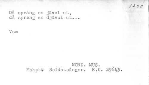 //// Då sprang en jävel ut, i //// då sprang en djävul ut... //// Vsm //// NORD. MUS. //// Mskpta Soldatsånger. E.U. 29645^ ////
