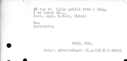 //// I Då tar vi lilla grålle fram i lång, //// [ å vi halar hå ... //// (not. uppt. E.Holm, öbäck) //// Vsm //// Karbenning //// { *** //// ^ NORD. MUS. //// Mskpt. Arbetssånger H,s.735.E.U.24932 ////