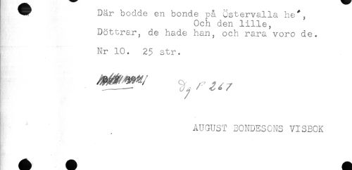 //// ^ Där bodde en bonde på östervalla he*. //// Och den lille, //// Döttrar, de hade han, och rara voro de. //// Nr 10. 25 str. //// - //// T //// AUGUST BONDESONS VISBOK //// * //// - ////