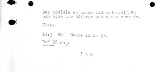 //// Där bod(d)e en bonde vid södervallaön //// han hade tre döttrar och raska voro de. //// Visa. //// 15:3 BO Brage 12 nr 43. //// DgF 39 (T^^ //// Å B 0 //// i //// ! ////