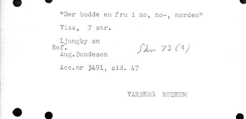 //// t'Der bodde en fru i no, no-, norden*? //// Visa, 7 str. //// Ljungby sn //// Ref' _ ^ 73 //// Aug.Bondeson //// Acc.nr 3491, sid. 47 //// VARBERG MUSEUM ////