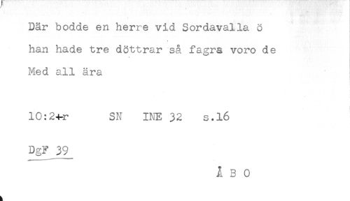 //// Där bodde en herre vid Sordavalla ö //// han hade tre döttrar så fagra voro de //// * //// Med all ära i //// i //// 10:2+r SM INE 32 s.l6 //// DgF 39_ //// ÅBO ////