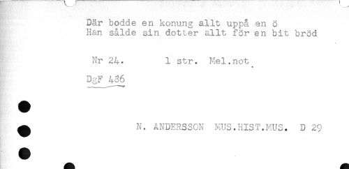 //// Där bodde en konung allt uppå en ö //// Han sålde sin dotter allt för en bit bröd //// Nr 24- 1 str. Mel.not //// * //// DgF 436 //// ^ N. AKDFRSSGN KUS.HIST.MUS. D 2? ////