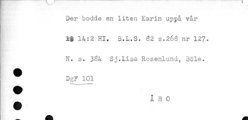 //// . //// Der bodde en liten Karin uppå vår //// - //// ig 14:2 Hl. S.L.S. 32 s.263 nr 127. //// N. s. 3^4 Sj.Lisa Rosenlund, Böle. //// ^ DgF 101 //// ^ ÅBO ////