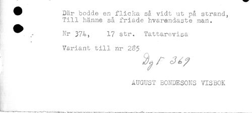 //// W Där bodde en flicka så vidt ut på strand, //// Till hänne så friade hvarandaste man. //// ^ Nr 374, 17 Str. Tattarevisa //// * //// Variant till nr 2^5 //// AUGUST BONDESONS VISBOK //// ^___..___ ////