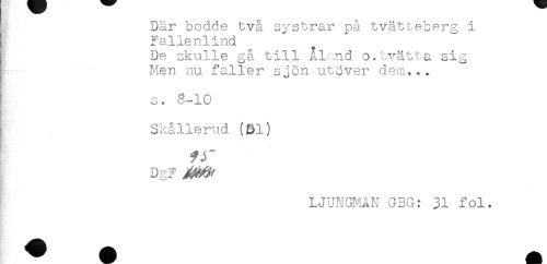 //// Där bodde två systrar på tvätteberg i //// Fallenlind //// De skulle gå till Åland o.tvätt,a sig //// Men nu faller sjön utöver dem... //// s, 6-10 //// Skållerud (&1) //// fr //// DgF ^ //// LJUNGMAN GBG: 31 fol. ////