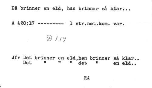 //// Då brinner en eld, han brinner så klar... //// A 420:17--- 1 str.not.kom. var. //// Jfr Det brinner en eld,han brinner så klar.. //// Det " " " det " en eld.. //// RA ////