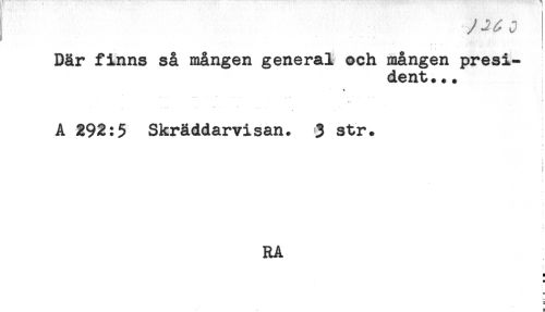 //// ^ J //// ! //// Där finns så mången general och mången presi- //// dent... //// * ^ //// A 292:5 Skråddarvisan. 3 str. //// ! //// RA ////