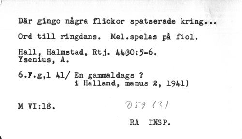 //// Där gingo några flickor spatserade kring... //// Ord till ringdans. Mel.spelas på fiol. //// Hall, Halmstad, Rtj. 4430:5-6. //// Ysenius, A. //// 6.F.g,l 41/ En gammaldags ? //// i Halland, manus 2, 1941) //// M VI:18. 7 //// RA INS P. ////