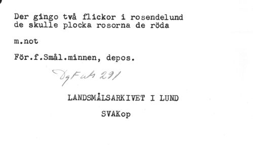 //// Der gingo två flickor i rosendelund //// de skulle plocka rosorna de röda //// m.not //// För.f.Smål.minnen, depos. //// LANDSMÅLSARKIVET I LUND //// SVAKop ////