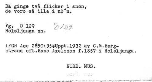 //// Dä ginge två flicker i snön, //// de voro så illa i nö^n. //// Vg. D 129 //// Holsljunga sn. //// IFGH Aoc 2350:353Uppt.1932 av C.M.Berg- //// strand eft.Hans Axelsson f.1357 i Holsljunga. //// NORD. MUS. ////