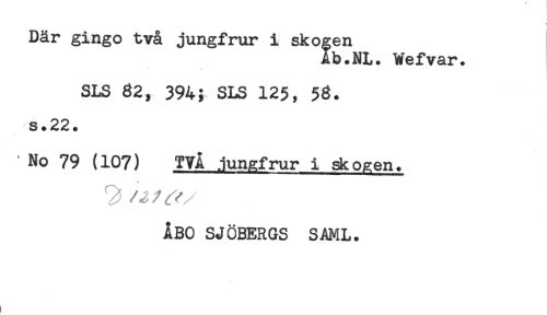 //// ) //// Där gingo två jungfrur i skogen //// Ab.NL. Wefvar. //// SLS 82, 394; SLS 125, 58. //// s.22. //// No 79 (107) TVÅ .jungfrur i skogen. //// ÅBO SJÖBERGS SAML. ////