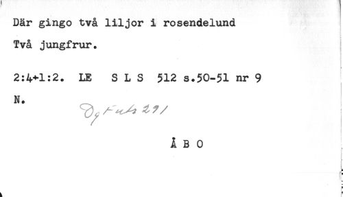 //// Där gingo två liljor i rosendelund //// Två jungfrur. //// ! //// t //// < //// 2:4+1:2. LE S L S 512 s.50-51 nr 9 //// N. //// ÅBO //// ! //// r //// * //// <= //// F //// t ////