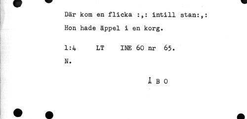 //// Där kom en flicka :,: intill stan:,: //// Hon hade åppel i en korg. //// 1:4 LT INE 60 nr 65. //// N. //// ÅBO //// M < 1. ////