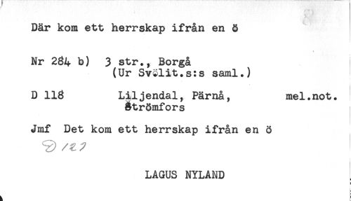 //// Där kom ett herrskap ifrån en § //// Nr 284 b) 3 str., Borgå //// (Ur Svälit.s:s saml.) //// D 118 Liljendal, Pärnå, mel.not. //// atrömfors //// Jmf Det kom ett herrskap ifrån en ö //// LAGUS NYLAND //// a ////