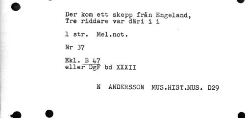 //// Der kom ett skepp från Engeland, //// Tre riddare var däri i i //// 1 str. Mel.not. //// Nr 37 //// Ekl. B 47 //// eller DgP bd XXXII //// N ANDERSSON MUS.HIST.MUS. D29 ////
