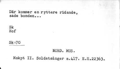 //// Där kommer en ryttare ridande, //// sade bonden... //// ! //// < //// Sk //// Hof //// ! //// Skn70 //// ! //// NORD. MUS. //// Mskpt II. Soldatsånger s.417. E.U.22363. //// : //// i //// f ////