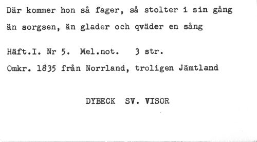 //// Dar kommer hon sa iager, sa stoiter i sm gang //// ån sorgsen, än gläder och qväder en sång //// Häft.I. Nr 5. Mel.not. 3 str. //// Omkr. 1835 från Norrland, troligen Jämtland //// DYBECK SV. VISOR ////