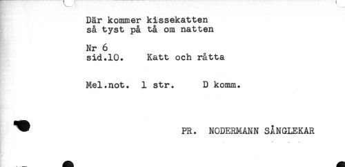 //// Där kommer kissekatten //// så tyst på tå om natten //// Nr 6 //// sid.10. Katt och råtta //// t?*. * //// Mel.not. 1 str. D komm. //// ^ PR. NODERMANN SÅNGLEKAR ////