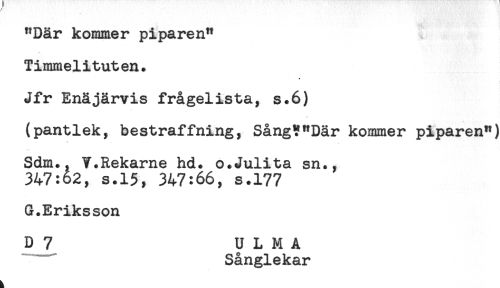 //// "Där kommer piparen" //// Timmelituten. //// Jfr Enåjärvis frågelista, s.6) //// (pantlek, bestraffning, SångT"Där kommer piparen") //// Sdm., V.Rekarne hd. o.Julita sn., //// 347:62, s.15, 347:66, s.177 //// G.Eriksson //// D 7 U L M A //// Sånglekar ////