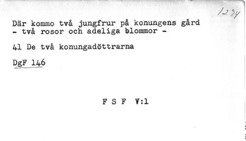 //// Där kommo två jungfrur på konungens gård //// - två rosor och adeliga blommor - //// 41 De två konungadöttrarna //// i //// DgF 146 //// F S F V:1 ////