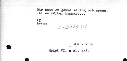 //// Där satt en gamma käring och spann, //// uti en mörker kammare... //// Vg //// Lerum //// jC!' //// - //// ^ NORD. MUS. //// Mskpt VI. x si. 1562 ////