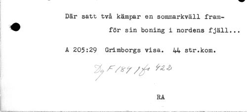 //// Där satt två kämpar en sommarkväll fram- //// * för sin boning i nordens fjäll... //// A 205:29 Grimborgs visa. 44 str.kom. //// RA //// ! ' -r ////