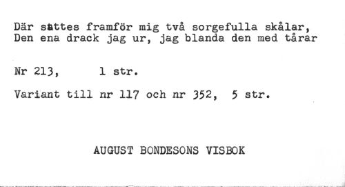 //// Där sattes framför mig två sorgefulla skålar, //// Den ena drack jag ur, jag blanda den med tårar //// Nr 213, 1 str. //// Variant till nr 117 och nr 352, 5 str. //// AUGUST BONDESONS VISBOK ////