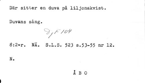 //// Där sitter en duva på liljonakvist. //// Duvans sång. //// 8:2+r. NÄ. S.L.S. 523 s.53-55 nr 12. //// N. //// t ////