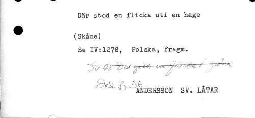 //// Där stod en flicka uti en hage //// ^ (Skåne) //// Se IV:1273, Polska, fragm. //// ANDERSSON SV. LÅTAR ////