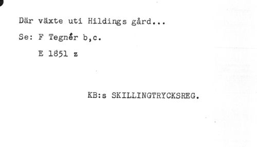 //// Där växte uti Hildings gård... //// Se: F Tegner b,c. //// E 1851 z //// \ //// KB:s SKILLINGTRYCKSREG. //// < ////