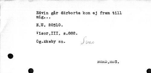 //// . . //// t //// ' //// Edvin går därborta kom ej fram till //// mig... //// E.U. 20310. //// - //// Visor,III. s.882. //// Ög.Rkeby sn. J //// NUnD.MuS. ////