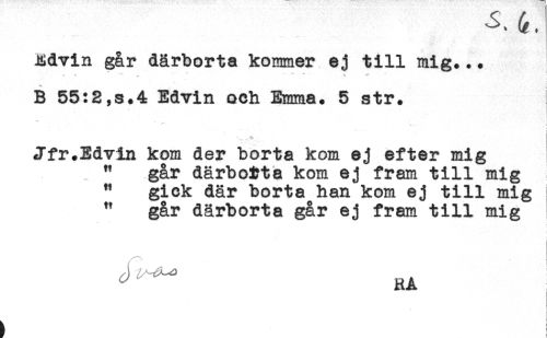 //// JUdvin går därborta kommer ej till mig... //// . ^ * ' - //// B 55:2,s.4 Edvin och Emma. 5 str. //// - //// Jfr.Edvin kom der borta kom ej efter mig //// " går därbotta kom ej fram till mig //// " gick där borta han kom ej till mig //// " går därborta går ej fram till mig //// ^ RA //// t ! ////