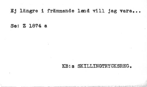 //// Ej längre i främmande land vill jag vara*.. //// Se: Z 1874 a //// * //// KB: s SKILLINGTRYCKSREG. ////