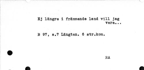 //// * //// Ej längre i främmande land vill jag //// vara... //// B 97, s.7 Längtan. 6 str.kom. //// - //// RA //// - ^^ ////