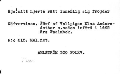 //// Ejaimitt hjerta rätt innerlig sig fröjdar //// Nåfvervisan. Förf af Vallpigan Elsa Anders- //// dotter o.sedan införd i 1695 //// års Psalmbok. //// N:o 213. Mel.not. //// AHLSTRÖM 300 FOLKV. //// J j ////
